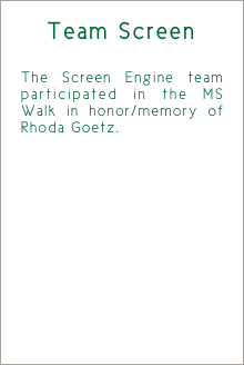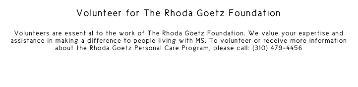 Volunteer for The Rhoda Goetz Foundation Volunteers are essential to the work of The Rhoda Goetz Foundation. We value your expertise and assistance in making a difference to people living with MS. To volunteer or receive more information about the Rhoda Goetz Personal Care Program, please call: (310) 479-4456 Team Screen The Screen Engine team participated in the MS Walk in honor/memory of Rhoda Goetz.